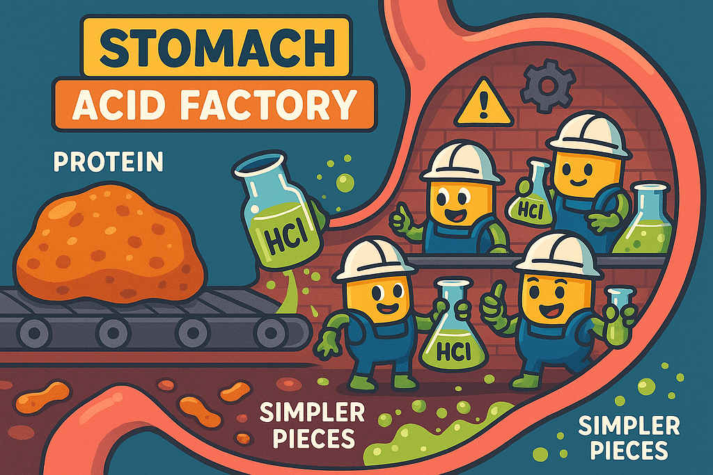 Your stomach is essentially a highly acidic protein processing plant. When protein arrives, several critical processes begin simultaneously: